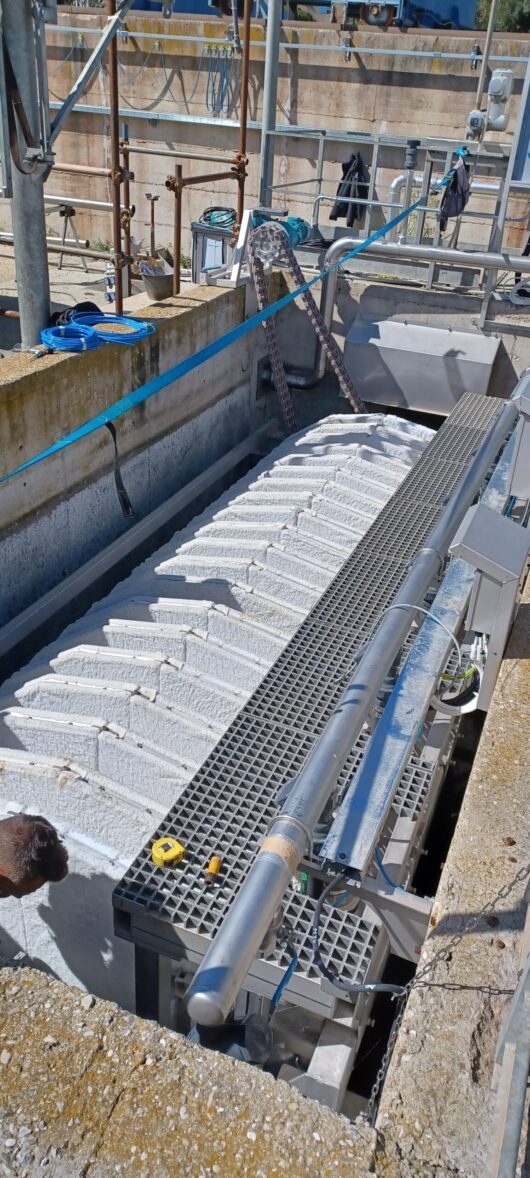 Zařízení fungující na OUT-IN filtračním principu, 100% ponořený Diskový filtr s filtrační tkaninou od 5 μm. Pile Cloth filtr „ORSO“ zaručuje maximální účinnost, minimální provozní náklady, odstranění NL, redukci BSK a CHSK a redukci fosforu až na 0,1 mg/l.